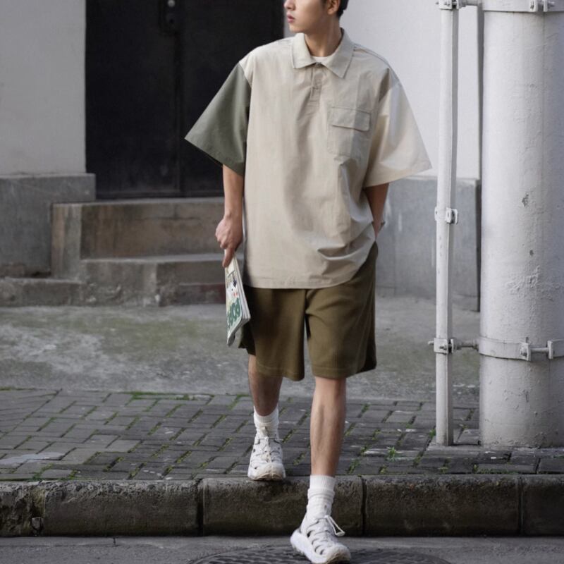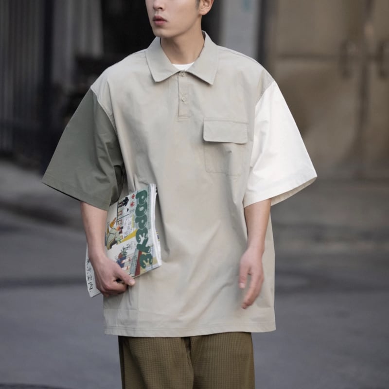 コントラストカラーパネルプルオーバー半袖シャツ 0722
