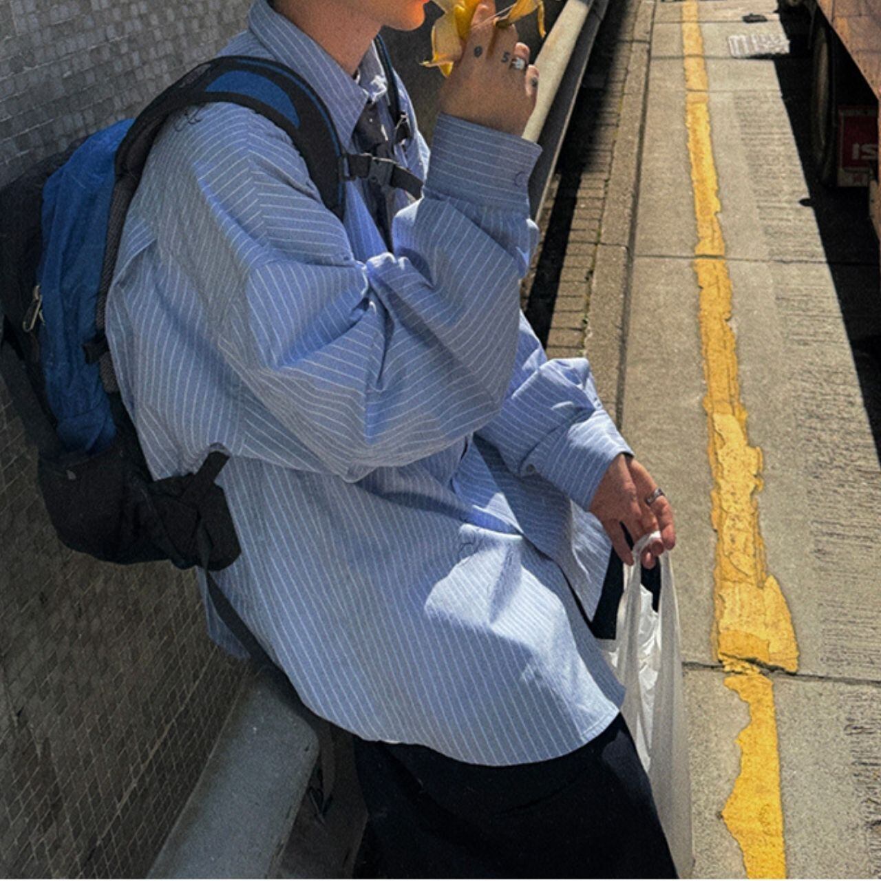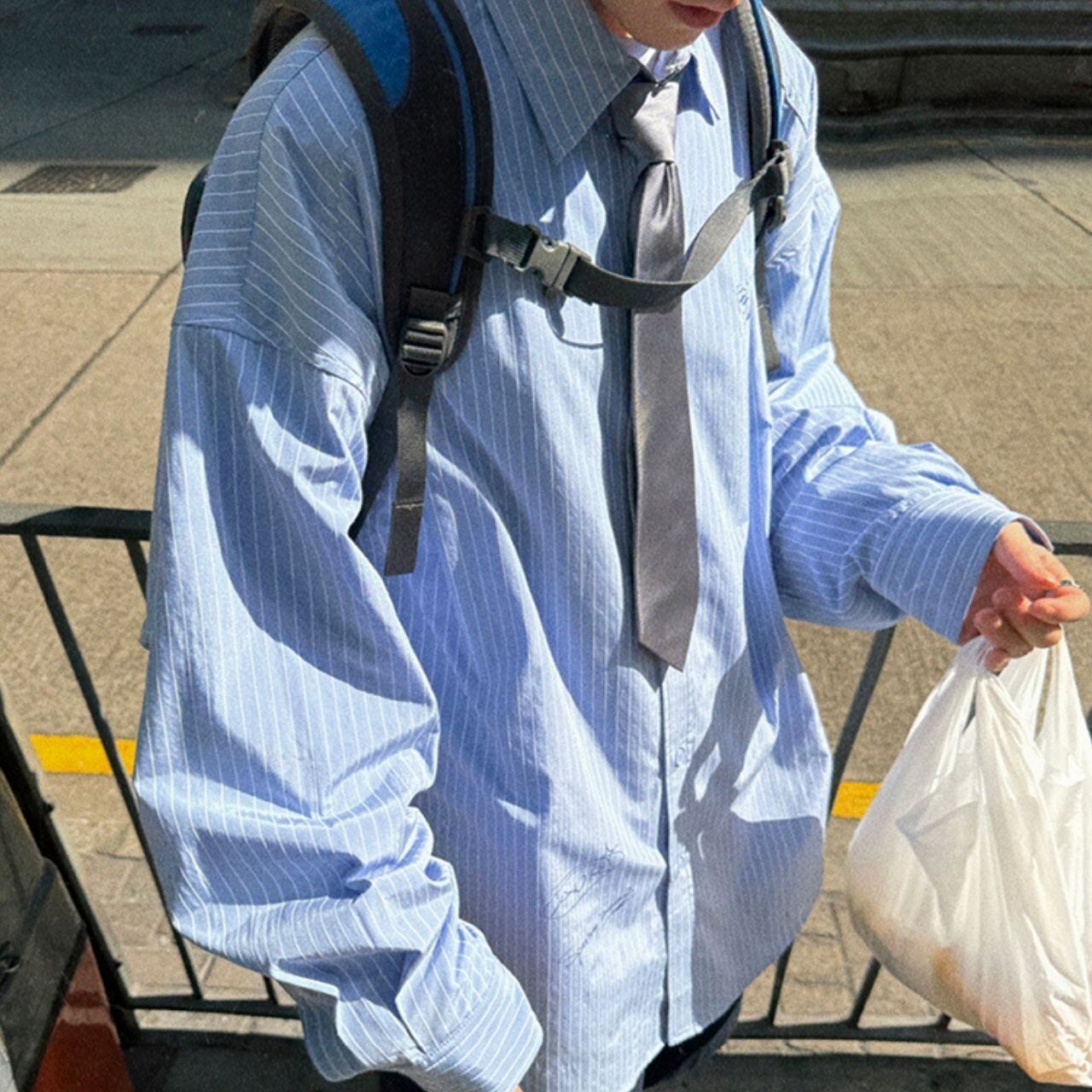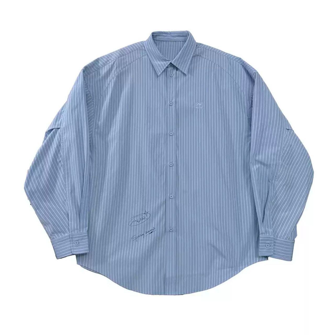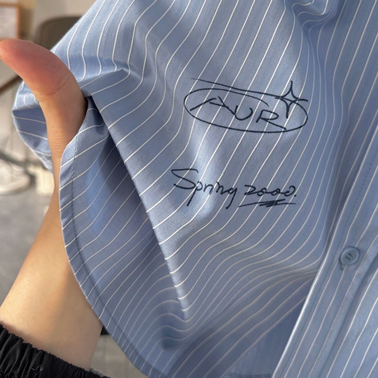ピンストライプ落書きエンブレムライトブルーシャツ 1118