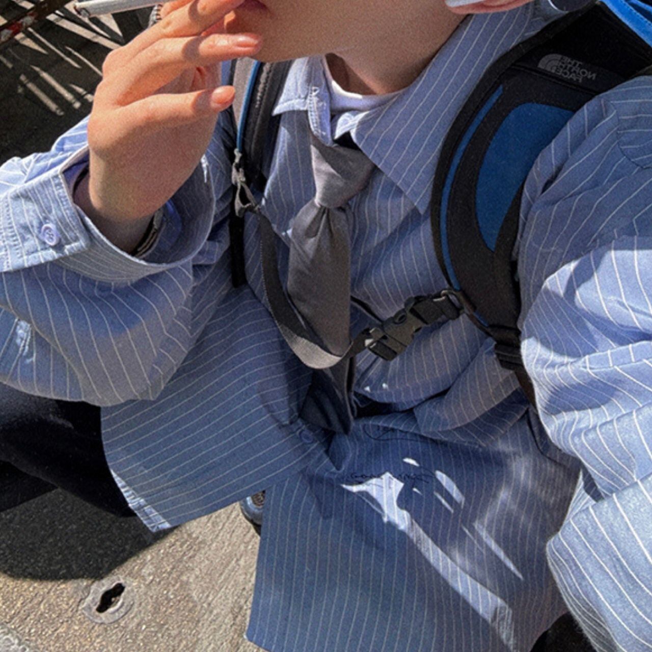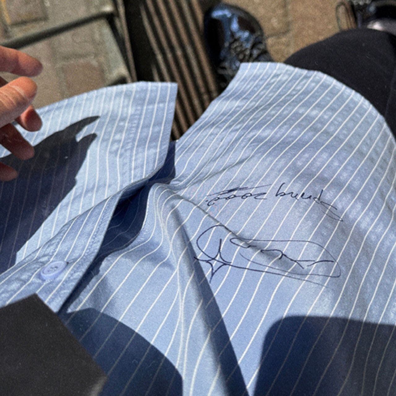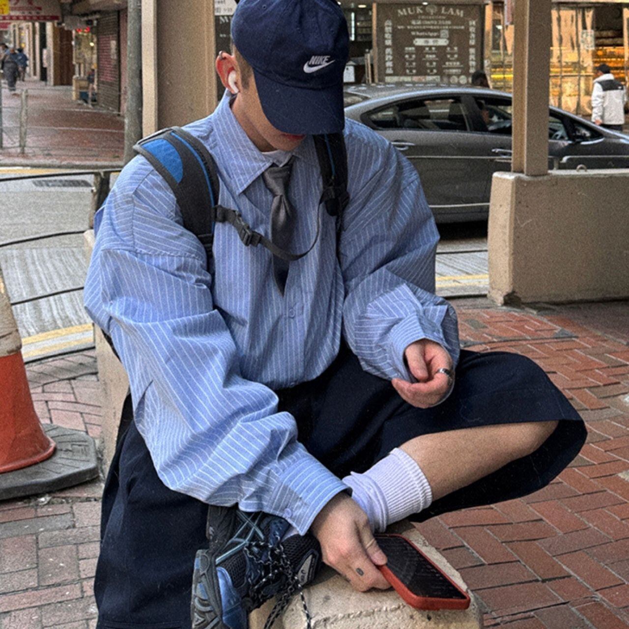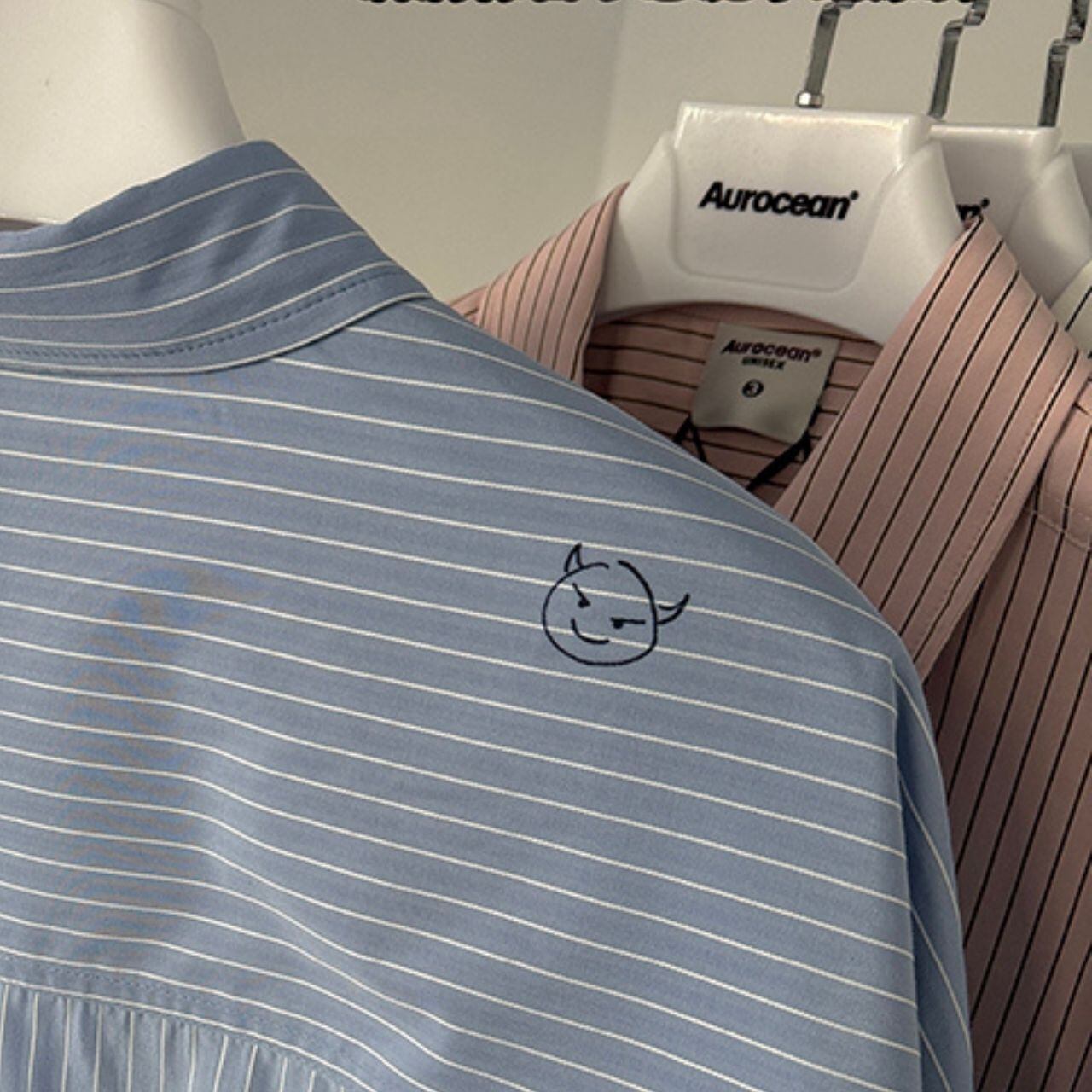 ピンストライプ落書きエンブレムライトブルーシャツ 1118