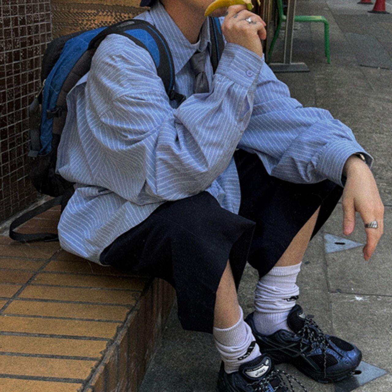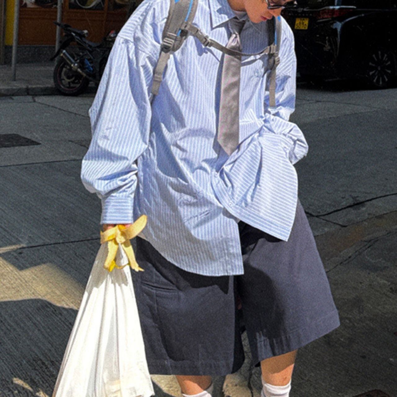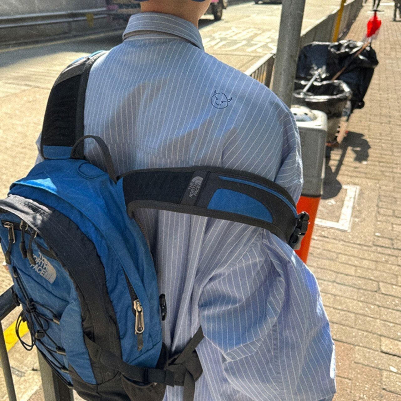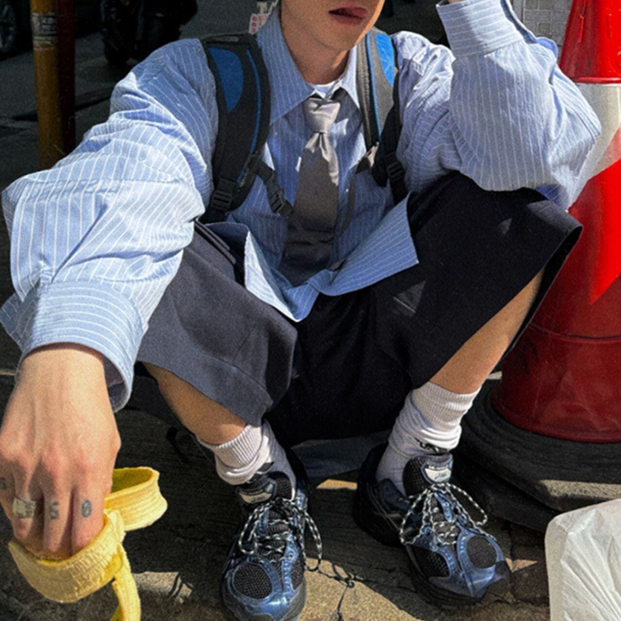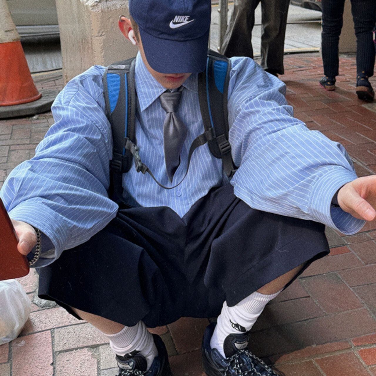 ピンストライプ落書きエンブレムライトブルーシャツ 1118