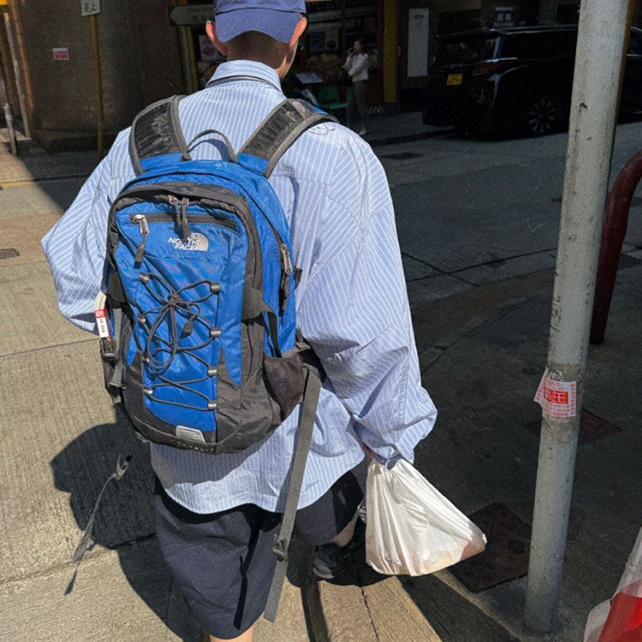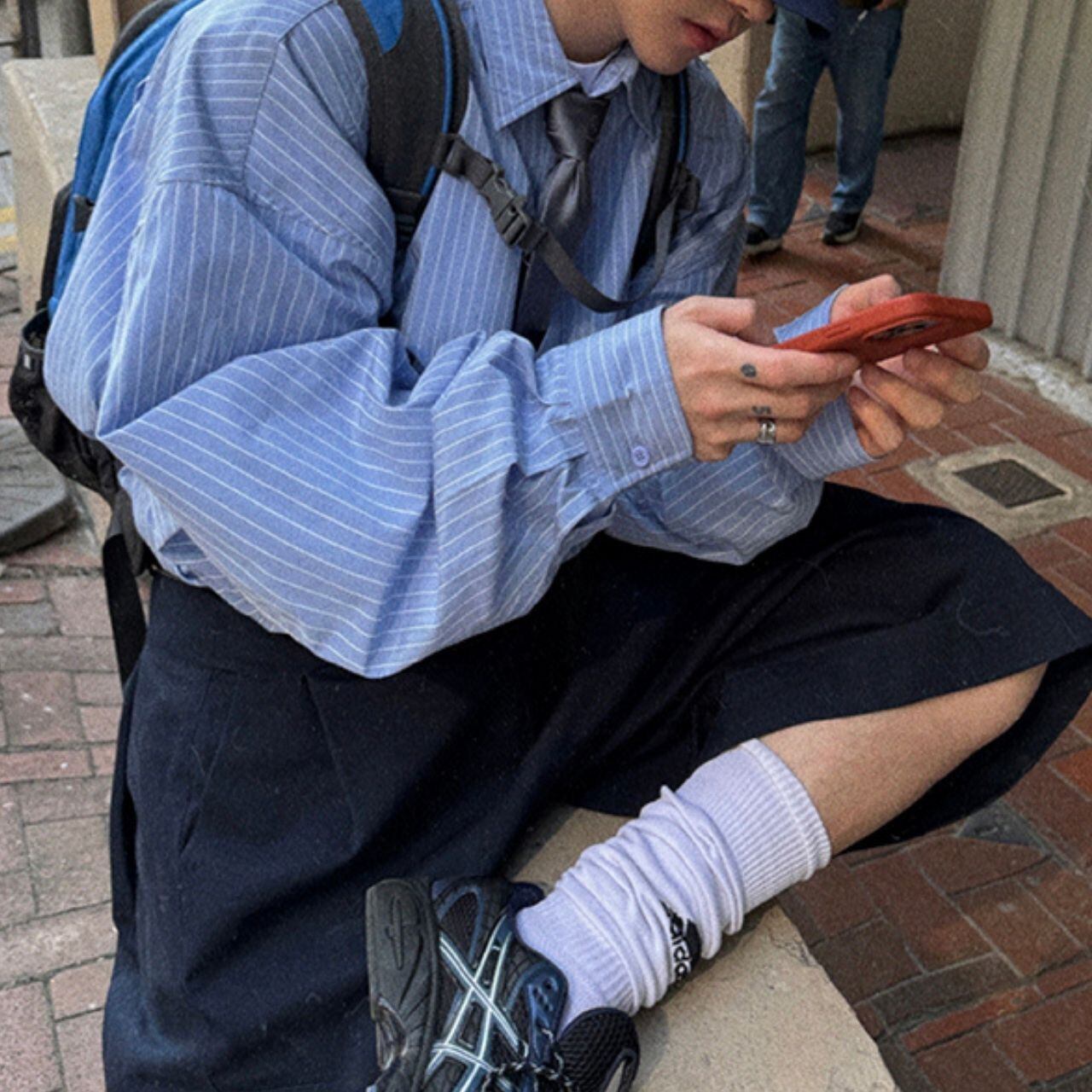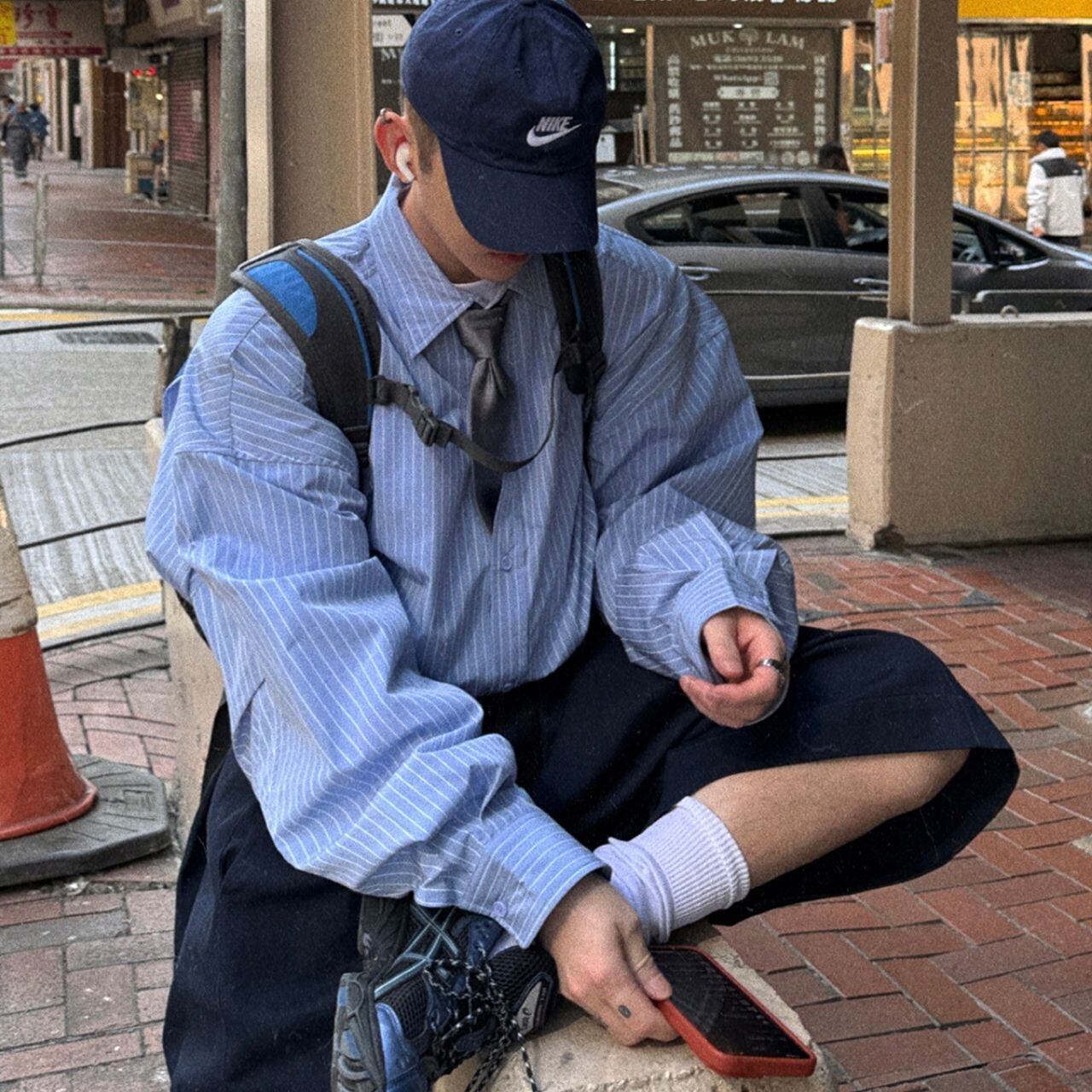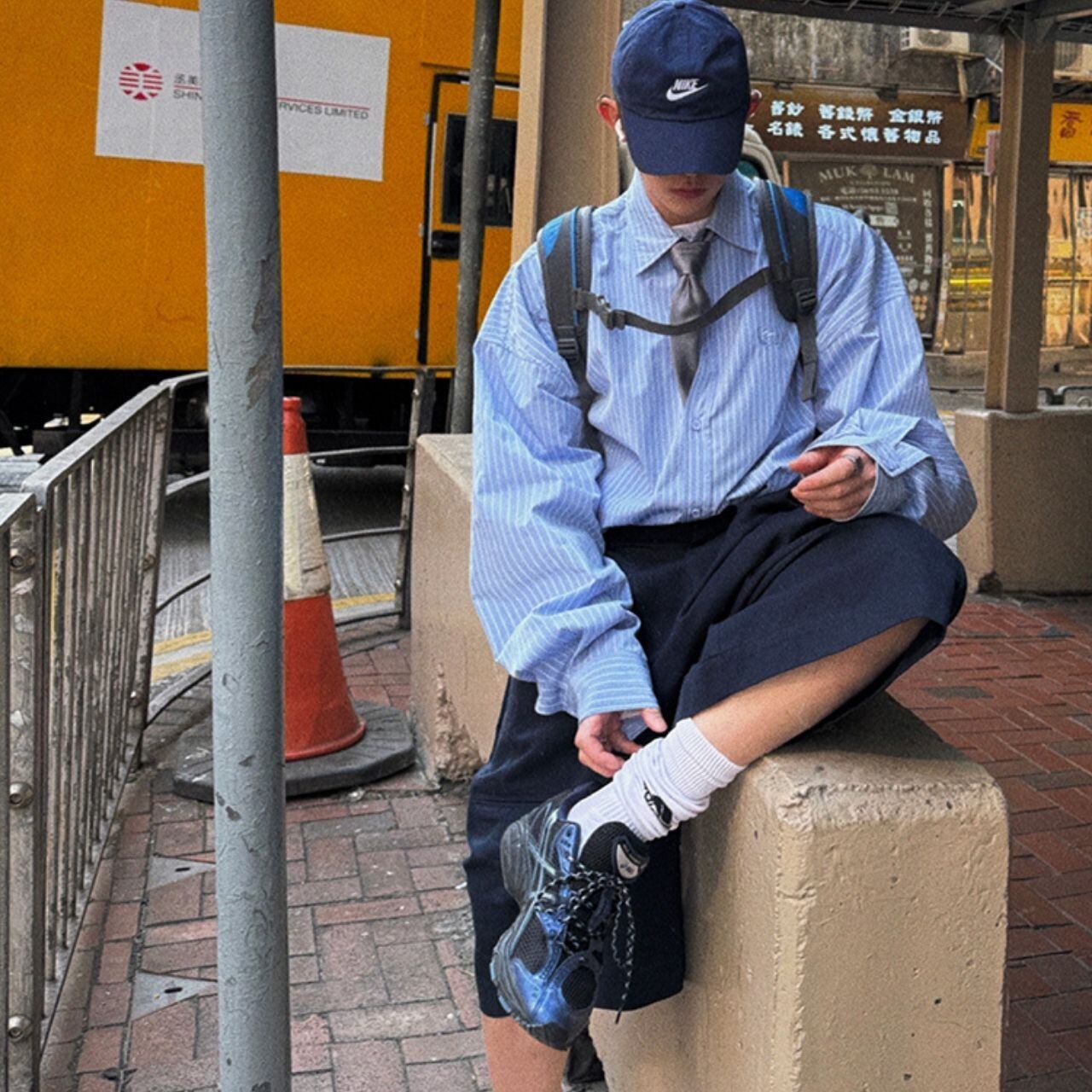 ピンストライプ落書きエンブレムライトブルーシャツ 1118
